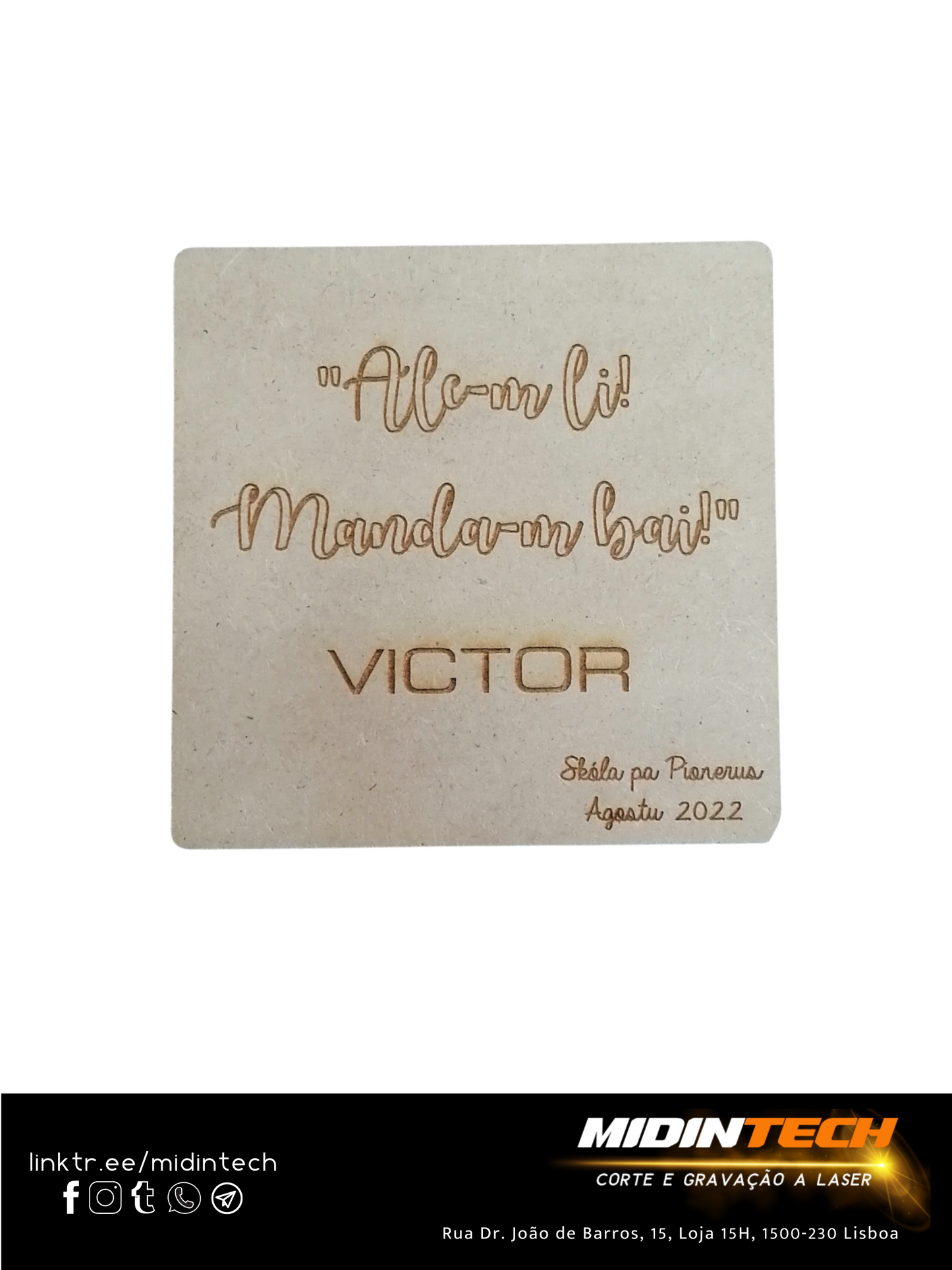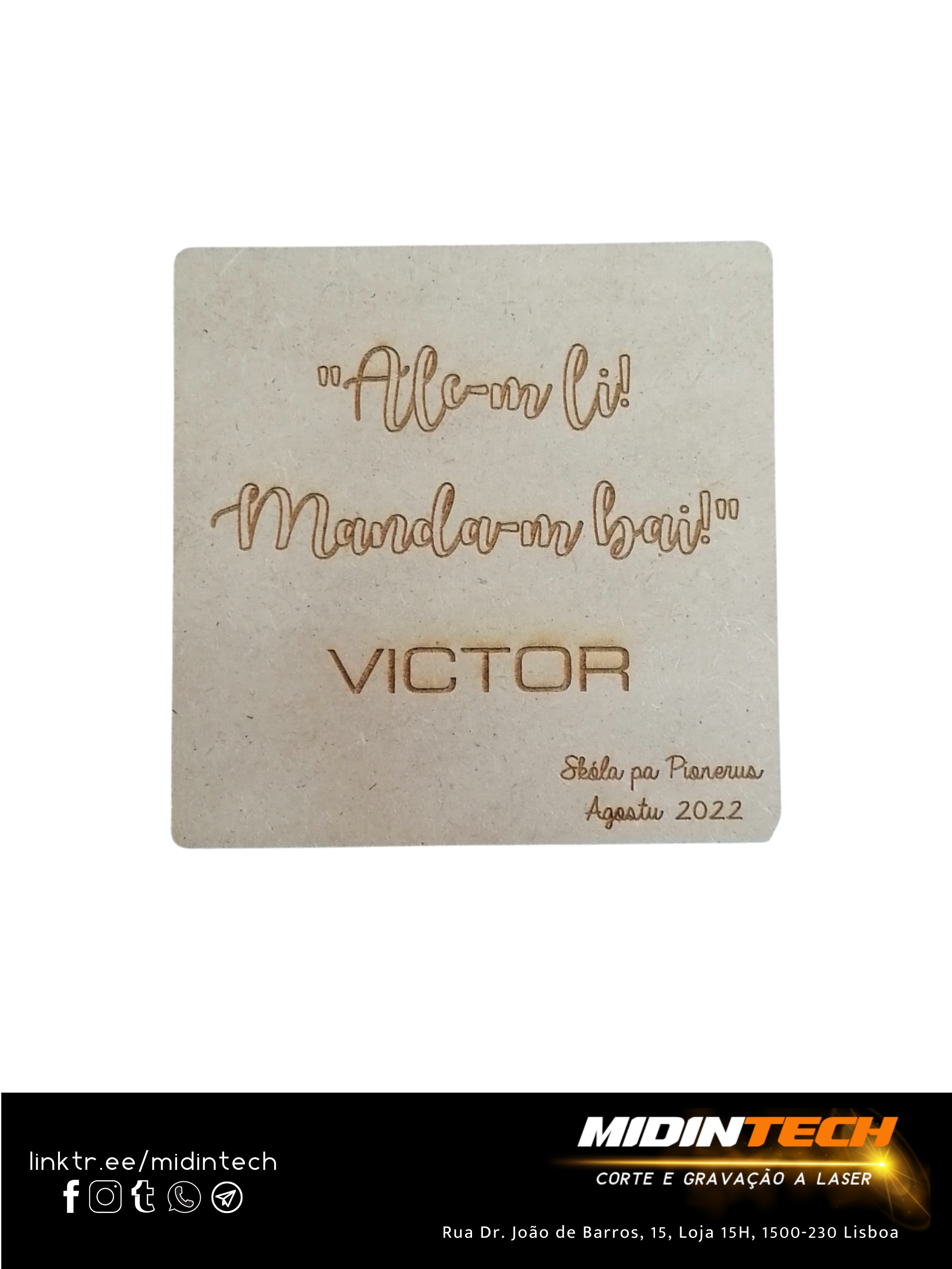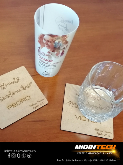 Base para copos personalizada a laser. Alusivo à Escola do Serviço de Pioneiro